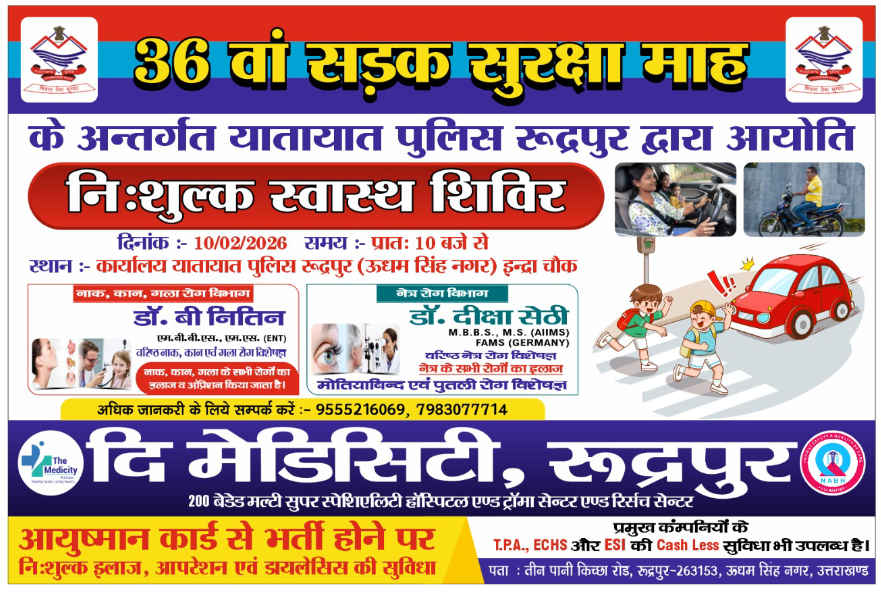 रुद्रपुर। दि मेडिसिटी, रुद्रपुर के द्वारा यातायात पुलिस कार्यालय इंद्रा चौक रुद्रपुर में 36 वाँ सड़क सुरक्षा माह के अंतर्गत कल दिनांक 10 फरवरी 2026 को निःशुल्क स्वास्थ्य व महा रक्तदान शिविर का आयोजन किया जा रहा है। शिविर के दौरान सड़क सुरक्षा से संबंधित जागरूकता कार्यक्रम भी चलाया जायेगा जिसमे चालकों को हेलमेट, सीट बेल्ट के उपयोग, ओवरस्पीडिंग से बचने, नशे की हालत में वाहन न चलाने तथा नियमित स्वास्थ्य जांच कराने के प्रति जागरूक भी किया जाएगा।